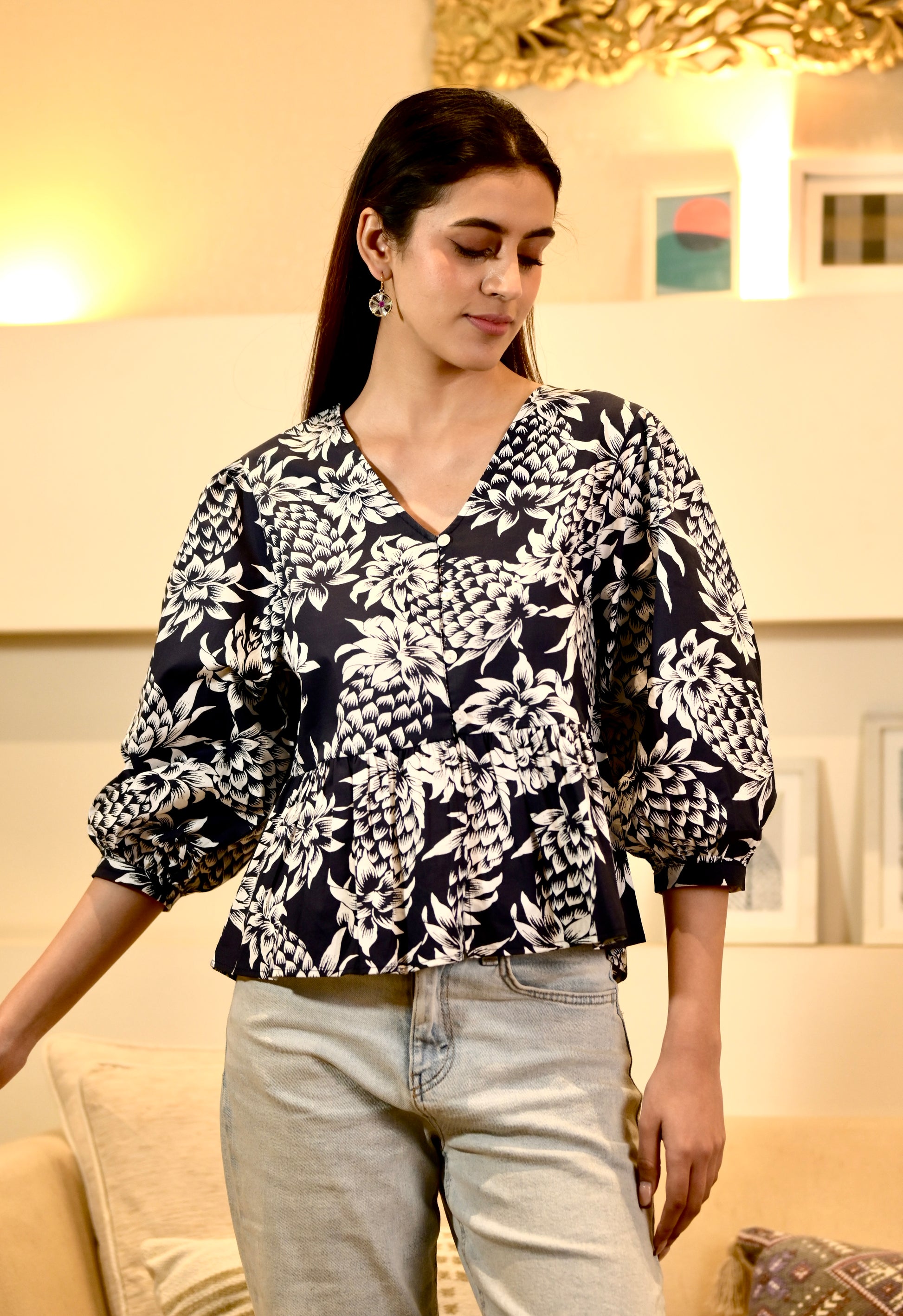 Elevate your wardrobe with our Deep Blue Floral Print Easy-Fitting Short-Sleeve Peplum Top, a fusion of comfort and style. This chic top boasts on-trend peasant sleeves with elastic cuffs and a flattering V-neckline. Its easy-fitting silhouette makes it a versatile piece, perfect for pairing with your favorite pants or denim. Crafted with quality materials and attention to detail, this top promises both comfort and sophistication. The deep blue floral print adds a touch of femininity, while the peplum hem creates a flattering silhouette. Embrace effortless elegance with this must-have addition to your closet.
